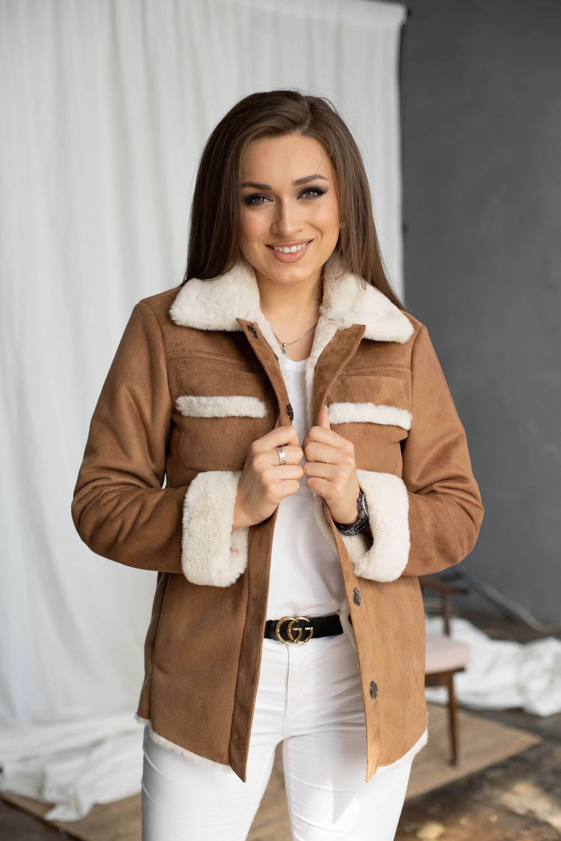Дублёнка женская демисезонная из искусственной замши с мехои